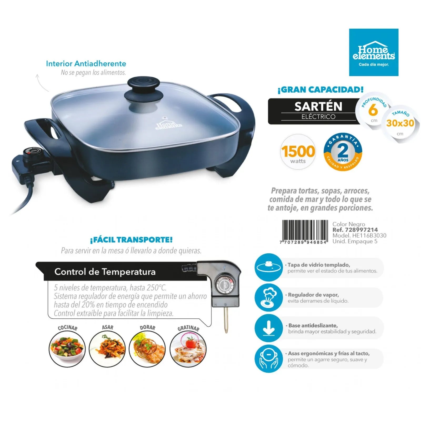Convierte tu cocina en el lugar perfecto para compartir grandes momentos con el sartén eléctrico Home Elements de 30x30 cm. Gracias a sus 1500W de potencia, podrás preparar desde recetas rápidas hasta platos más elaborados en porciones generosas y sin complicaciones.