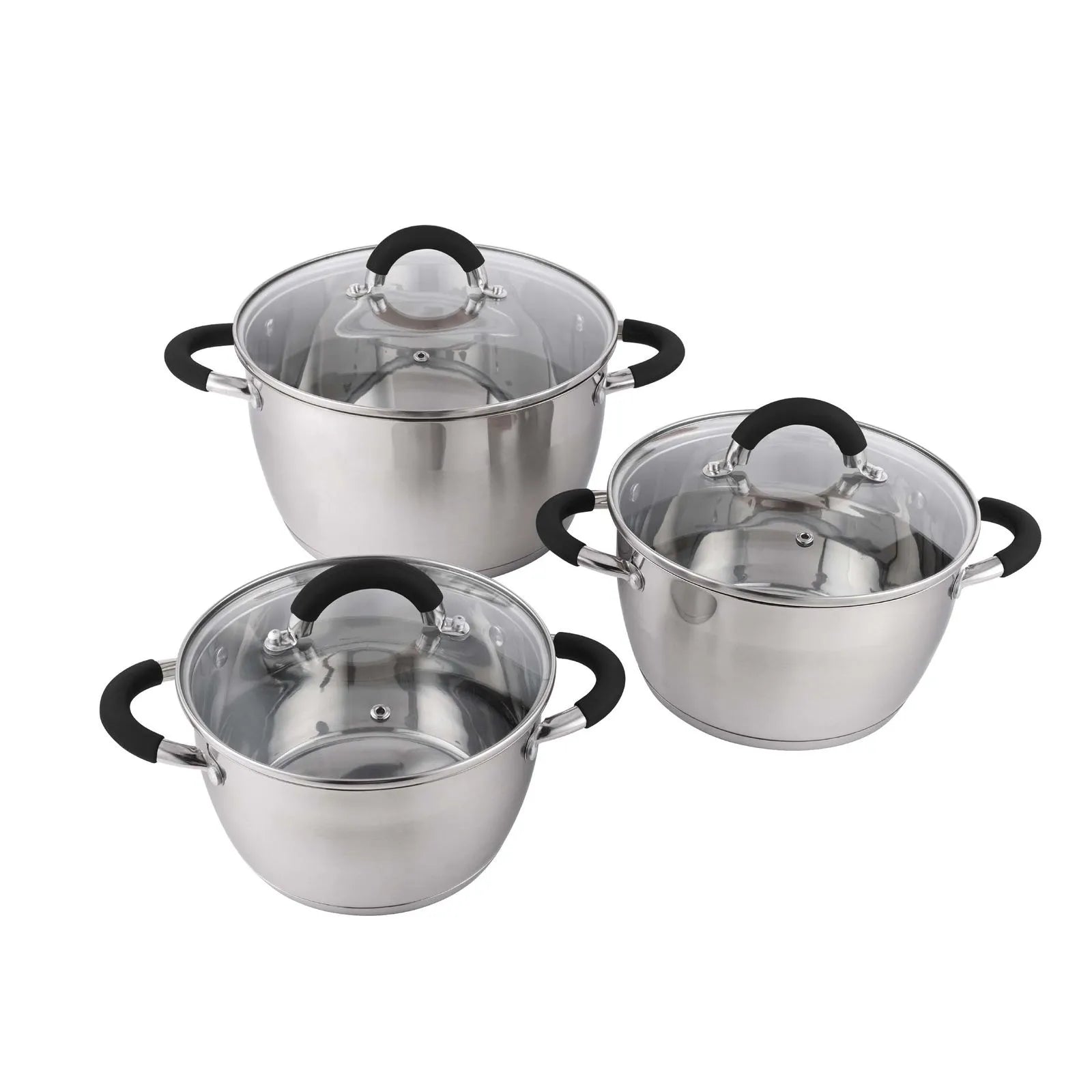 Cada olla cuenta con tapas de vidrio templado con regulador de vapor y asas en silicona que aseguran un agarre cómodo y seguro. Su base conductora distribuye el calor de manera uniforme, lo que garantiza una cocción más rápida y eficiente.