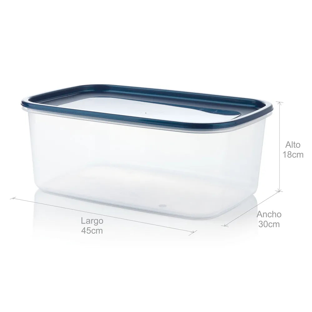 Su cuerpo transparente permite visualizar el contenido de forma rápida y eficiente, mientras que su diseño apilable y encajable optimiza el espacio disponible.
