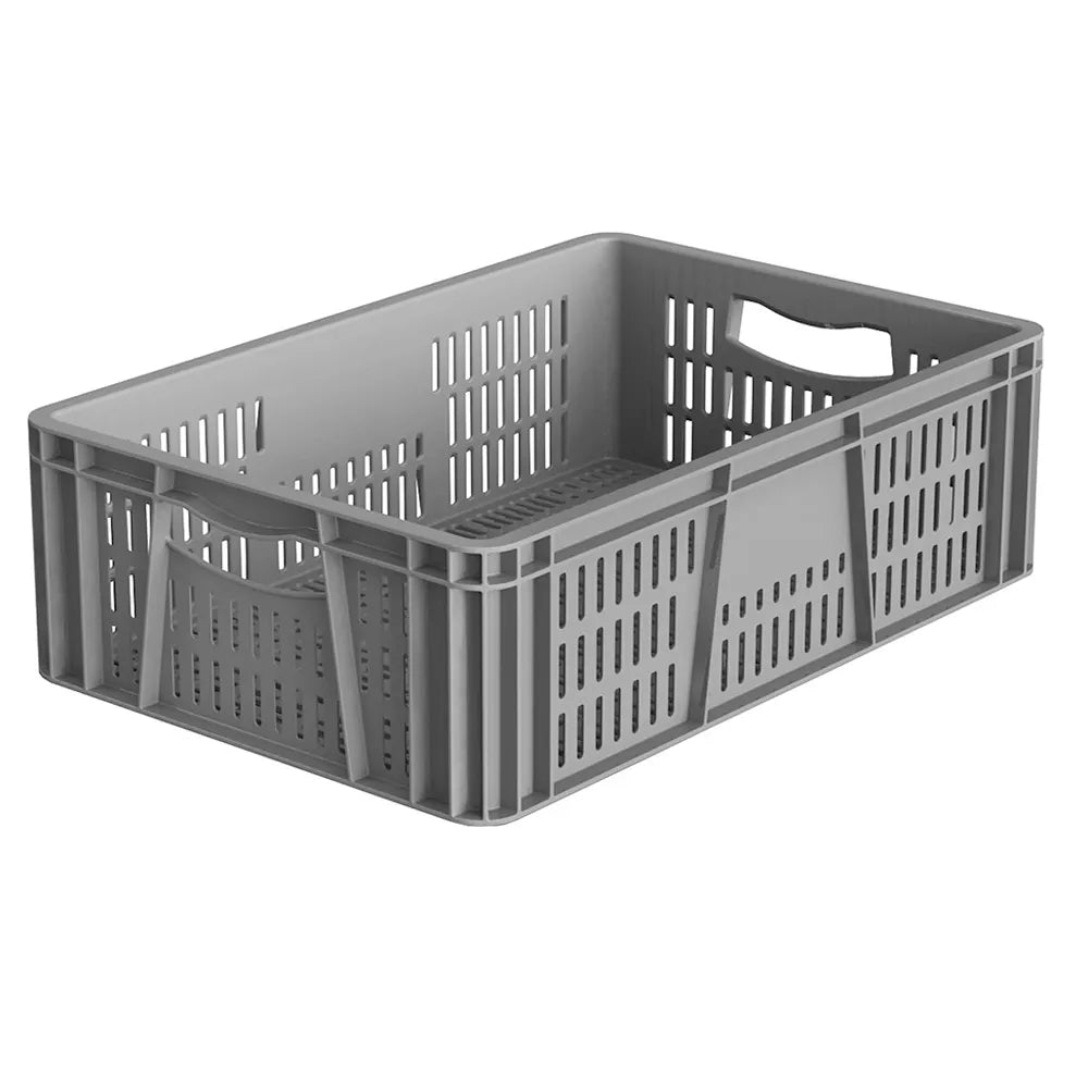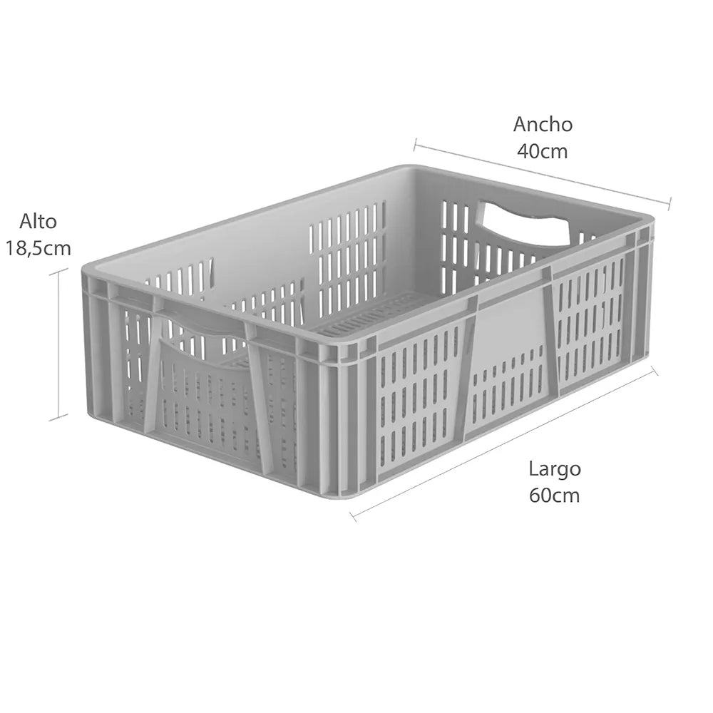 Caja fabricada en polietileno de alta densidad (PEAD), reutilizable, retornable y 100% reciclable. Su diseño apilable garantiza excelente estabilidad al arrume, ofreciendo eficiencias y ahorros en producción, almacenaje, transporte y distribución. Compatible con pallet o estibas de 1 x 1,2 m.