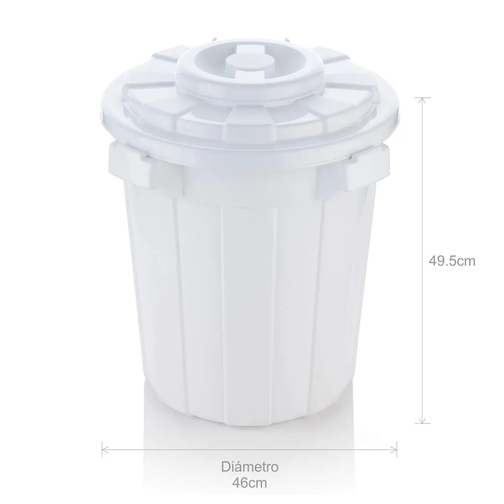 Caneca de 37 litros en color blanco, ideal para almacenar una gran variedad de elementos como ropa, juguetes, implementos deportivos, agua o incluso alimentos. Su diseño incorpora una práctica sobretapa que permite acceso rápido al contenido sin retirar completamente la tapa principal, la cual incluye un cierre giratorio para mayor seguridad.