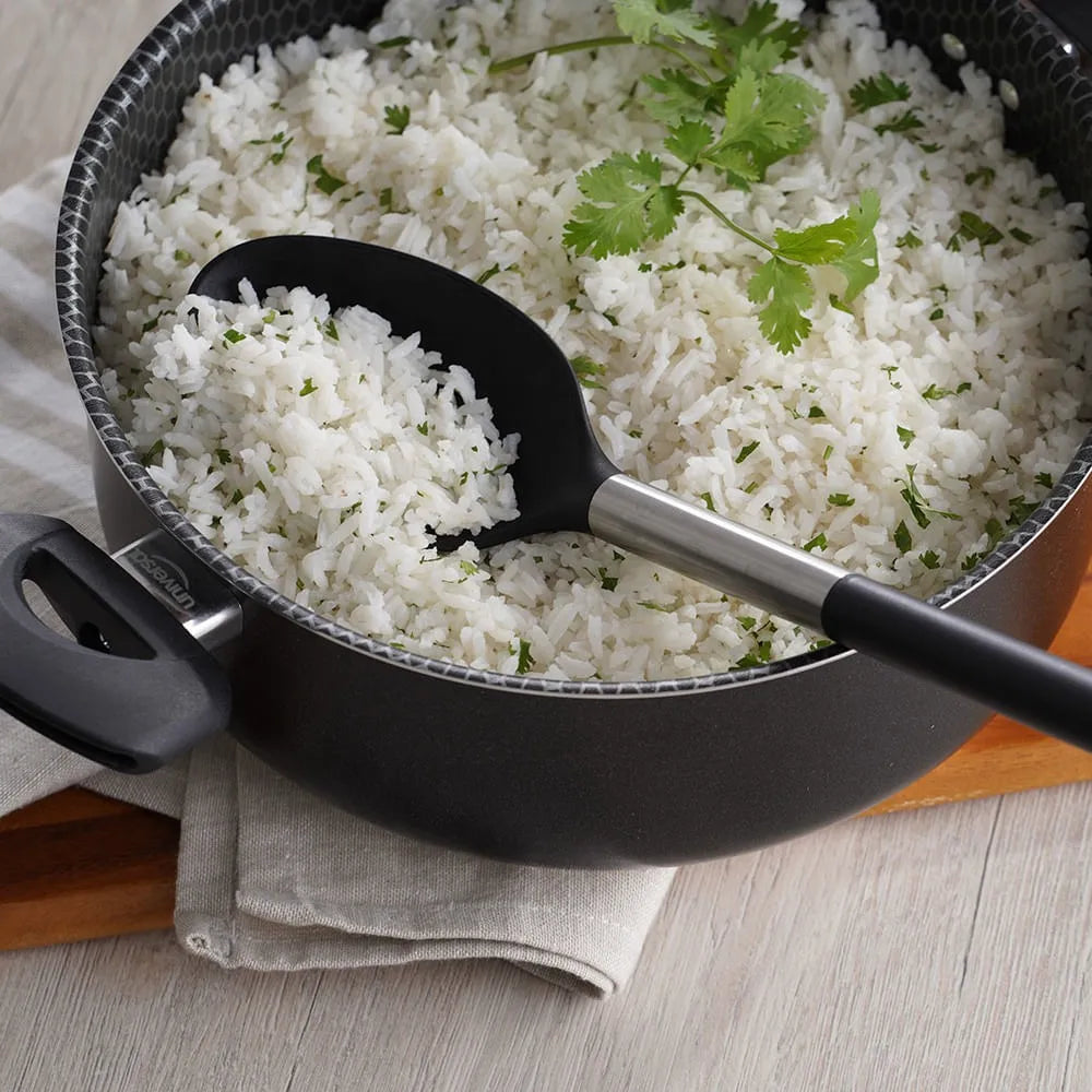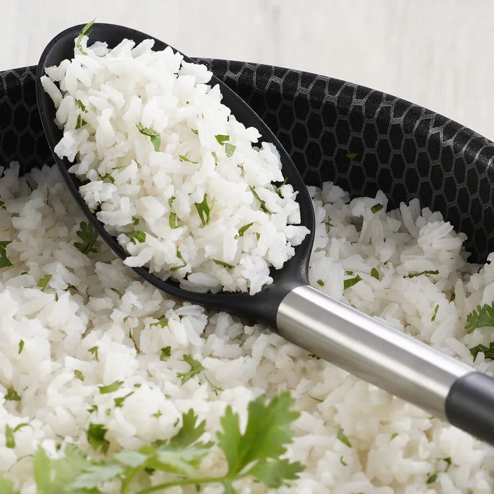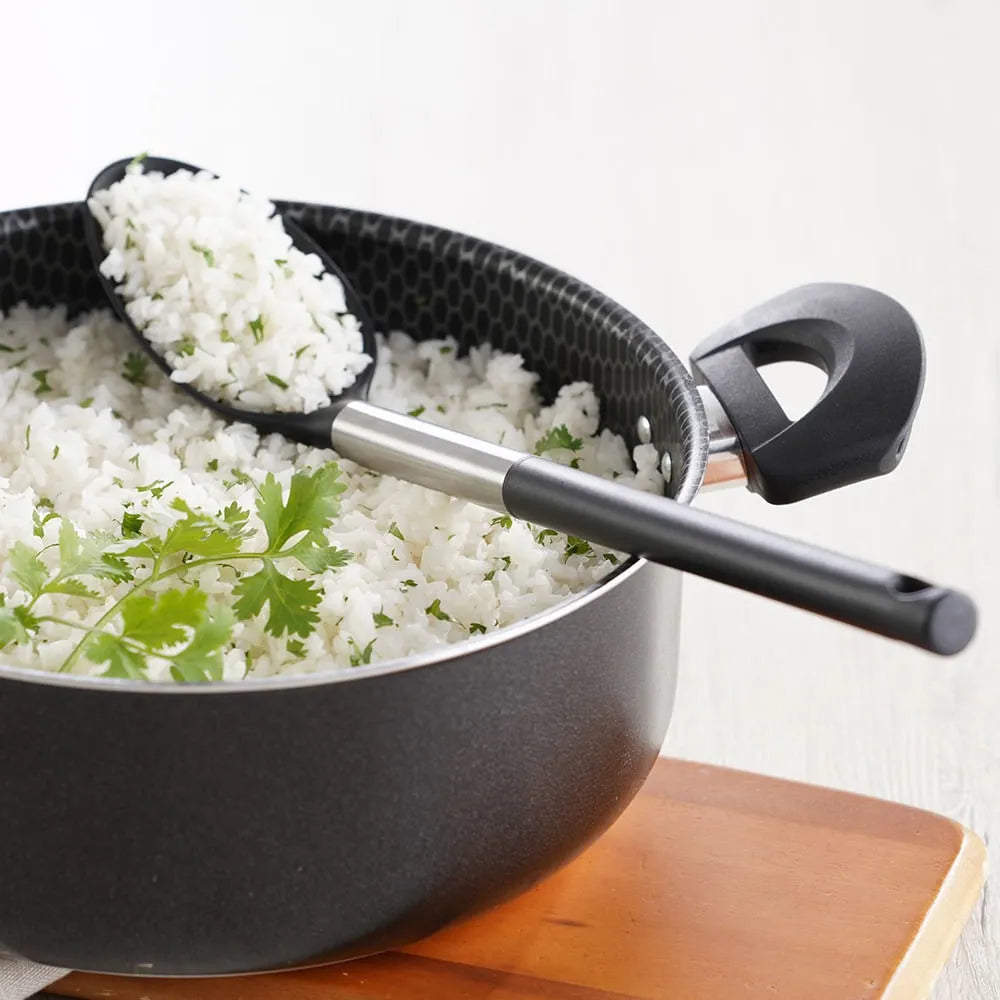 La Cuchara Esencial está diseñada para acompañarte en la preparación de tus comidas favoritas. Su servicio en nylon resiste hasta 210°C, lo que la hace ideal para usar con superficies antiadherentes sin dañarlas. Cuenta con un mango en polipropileno con decoración metálica y una perforación para colgar, combinando funcionalidad y estilo en tu cocina. Además, es apta para lavavajillas para una limpieza práctica.