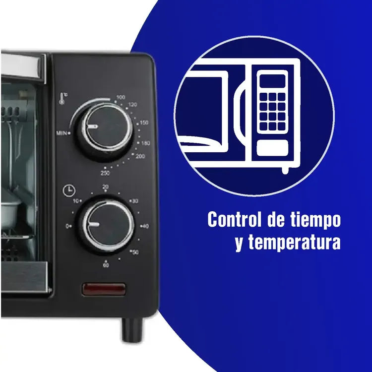 Cuenta con control de temperatura de hasta 250°C y un temporizador de 60 minutos con alarma, que te permitirá ajustar los tiempos de cocción de acuerdo a cada receta. Además, si caen residuos como migas o aceites en la parte inferior, el horno se puede limpiar fácilmente gracias a su bandeja removible, manteniéndolo siempre limpio.
