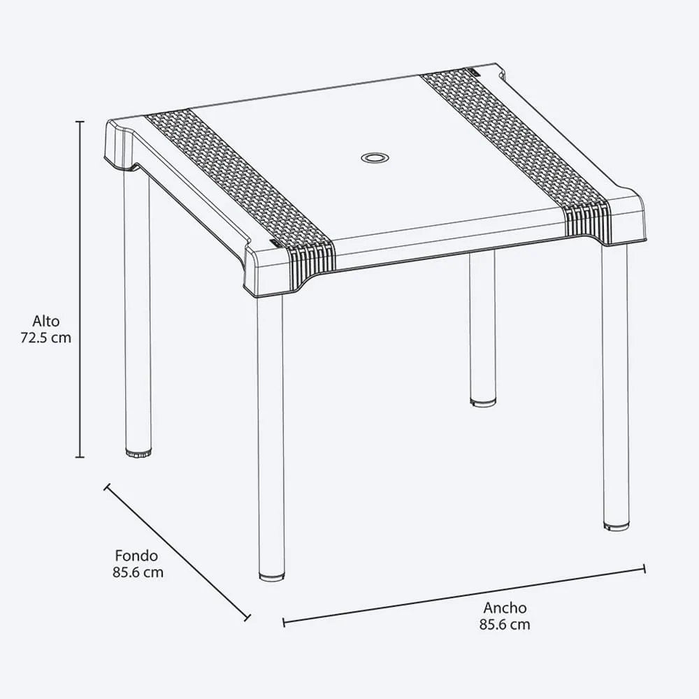 La Mesa SHIA combina la elegancia del tejido perforado que imita el trabajo artesanal con la resistencia de sus patas en aluminio, que no se oxidan. Su diseño cuadrado de 85 x 85 cm la hace ideal para comedores, terrazas y jardines. Incluye un tapón central para colocar un parasol y tacón nivelador para mayor estabilidad. Es fácil de armar sin herramientas y de limpiar, perfecta para uso en interiores o exteriores.