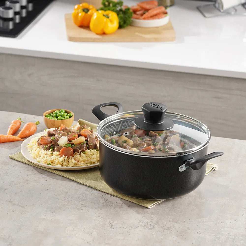 Fabricada en aluminio resistente, cuenta con un recubrimiento antiadherente interior que facilita una cocción saludable y evita que los alimentos se peguen, manteniendo su sabor y textura natural. Su tapa de vidrio templado permite monitorear la cocción sin perder calor, mientras que sus asas resistentes al calor aseguran un manejo cómodo y seguro.