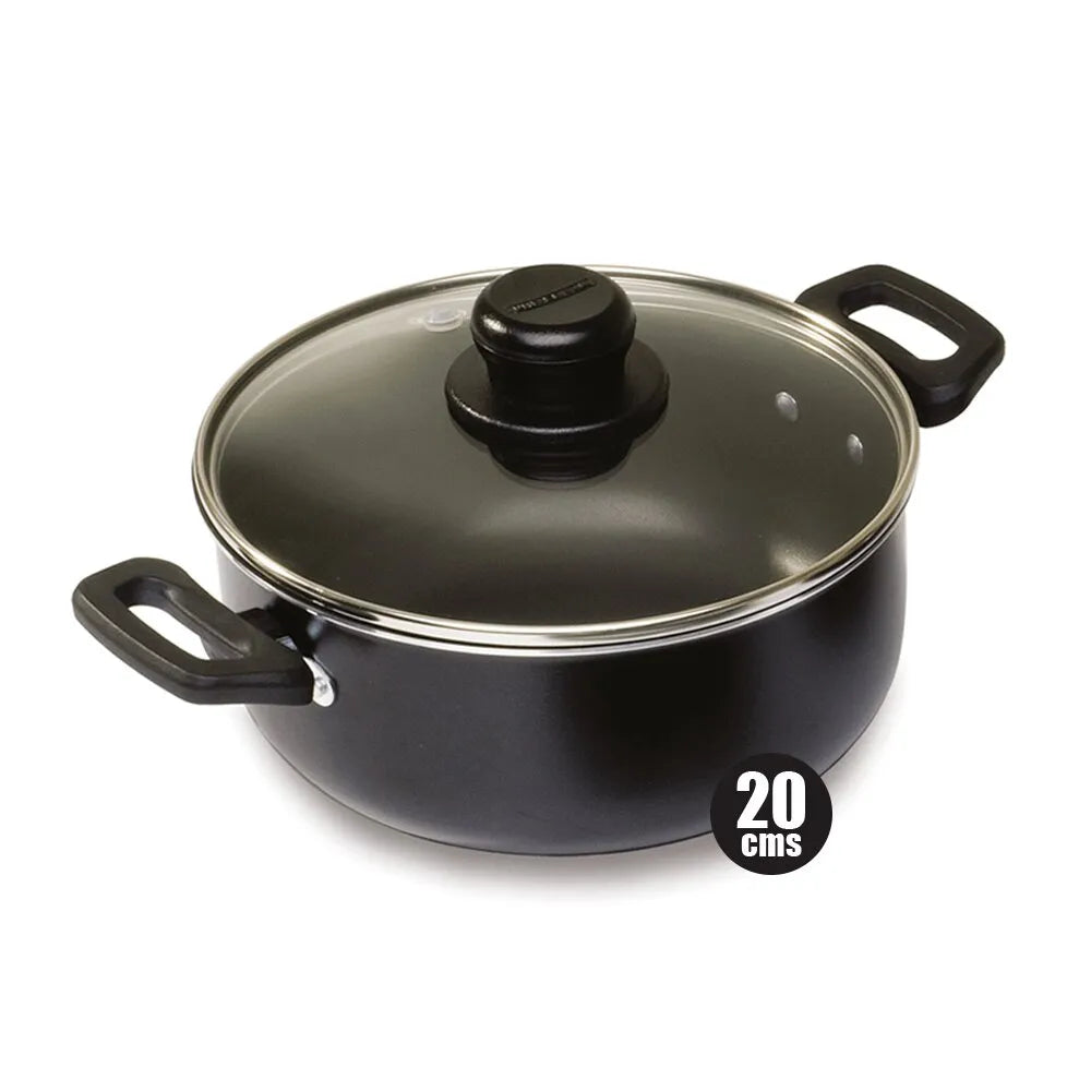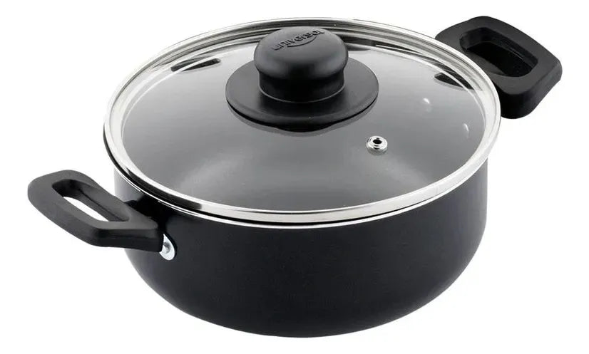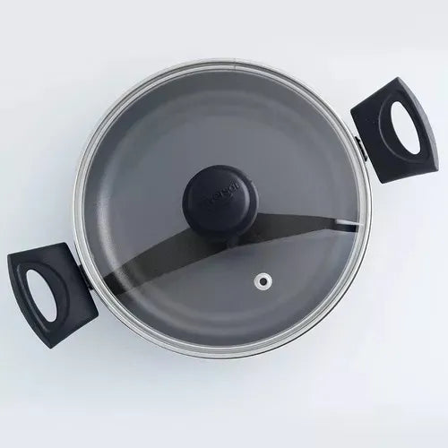 Fabricada con materiales de alta calidad, su estructura resistente garantiza una distribución uniforme del calor para lograr cocciones perfectas. La tapa de vidrio templado permite supervisar tus preparaciones sin perder calor ni sabor, mientras que sus asas ergonómicas facilitan un manejo seguro.