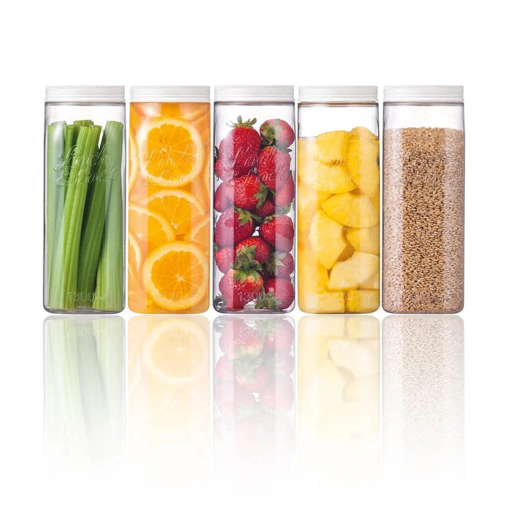 Recipientes herméticos con tapa rosca, ideales para almacenar alimentos sólidos y líquidos. Su diseño está desarrollado con una forma práctica para organizar en la puerta de la nevera o en la despensa. Son ligeros, fáciles de lavar y guardar, libres de BPA y seguros para el contacto con alimentos.