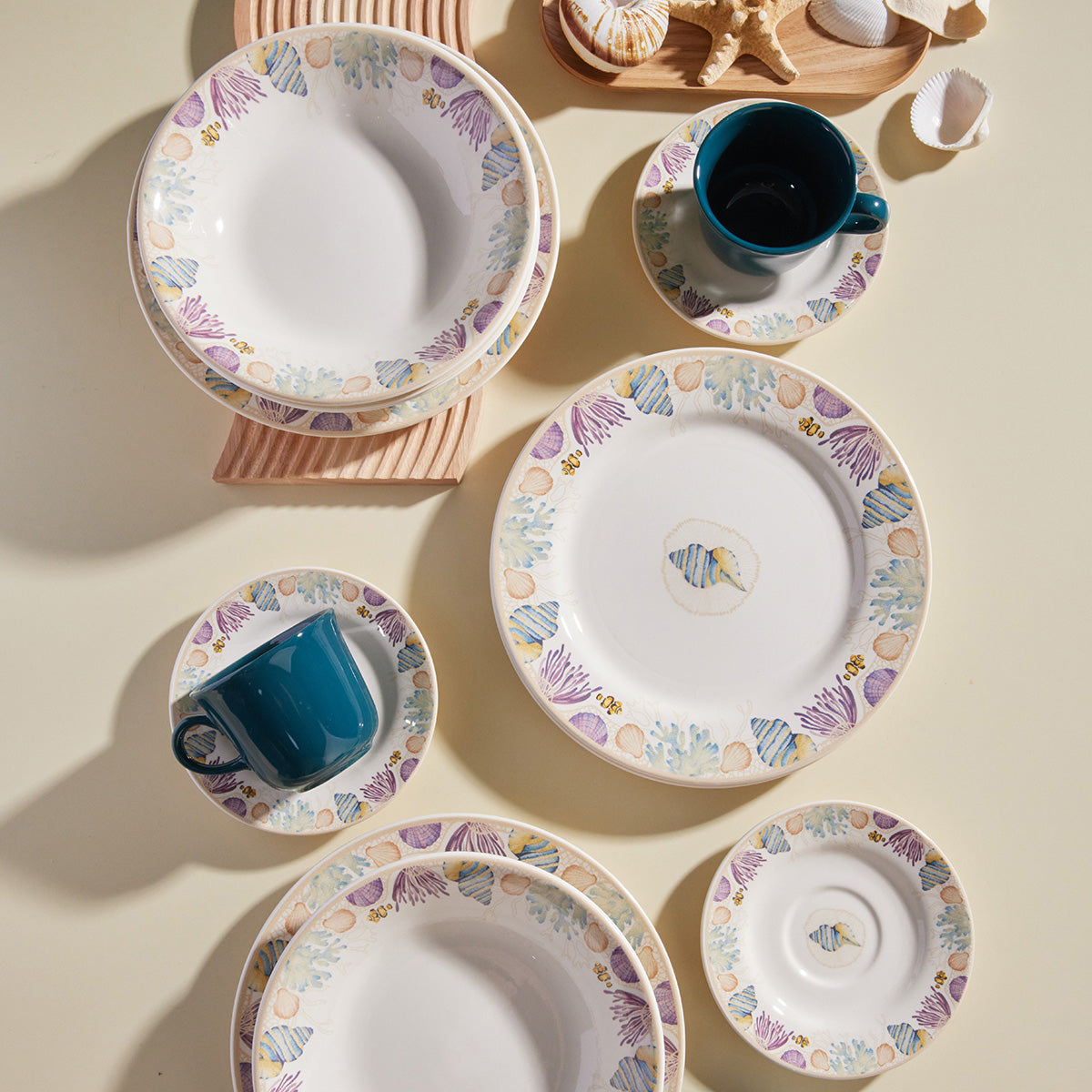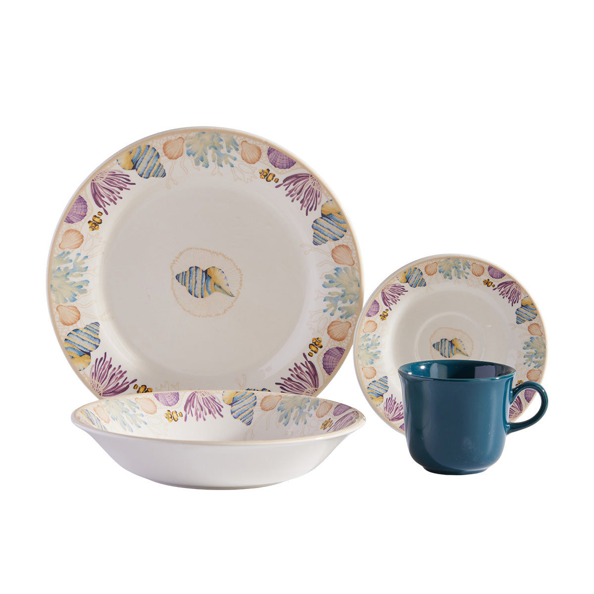 Sumérgete en la riqueza de los arrecifes con esta vajilla de 16 piezas que combina funcionalidad y arte en cada detalle. Sus patrones vibrantes de corales, peces y conchas evocan la vida submarina en su máximo esplendor, creando una mesa llena de frescura y dinamismo.