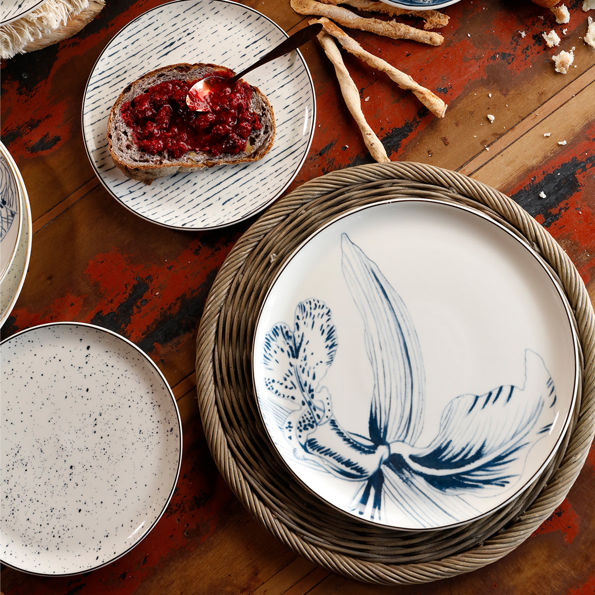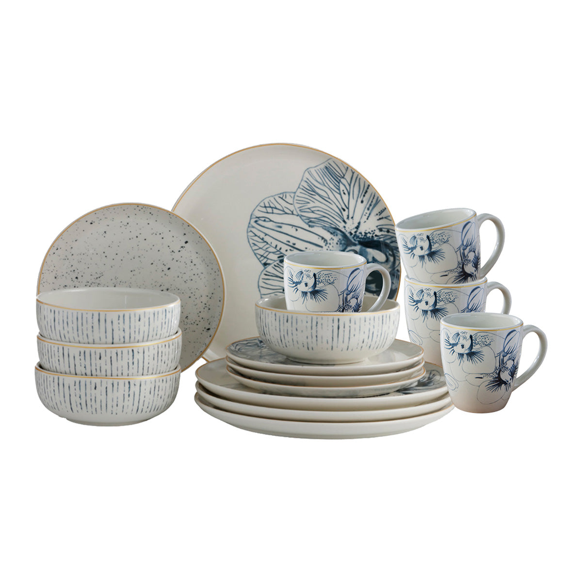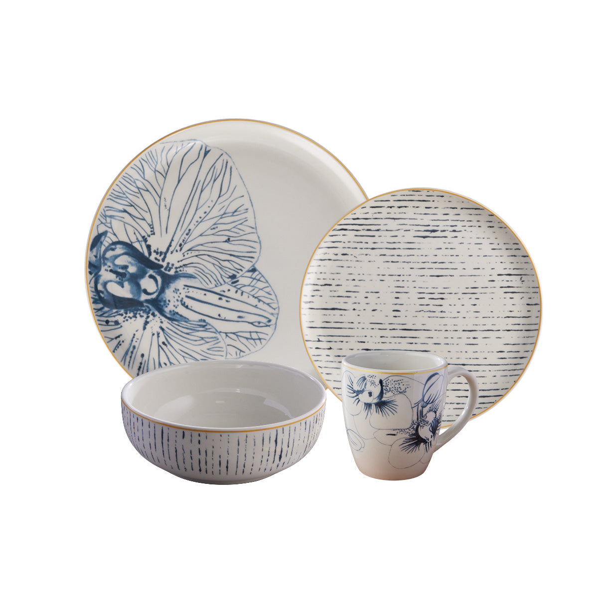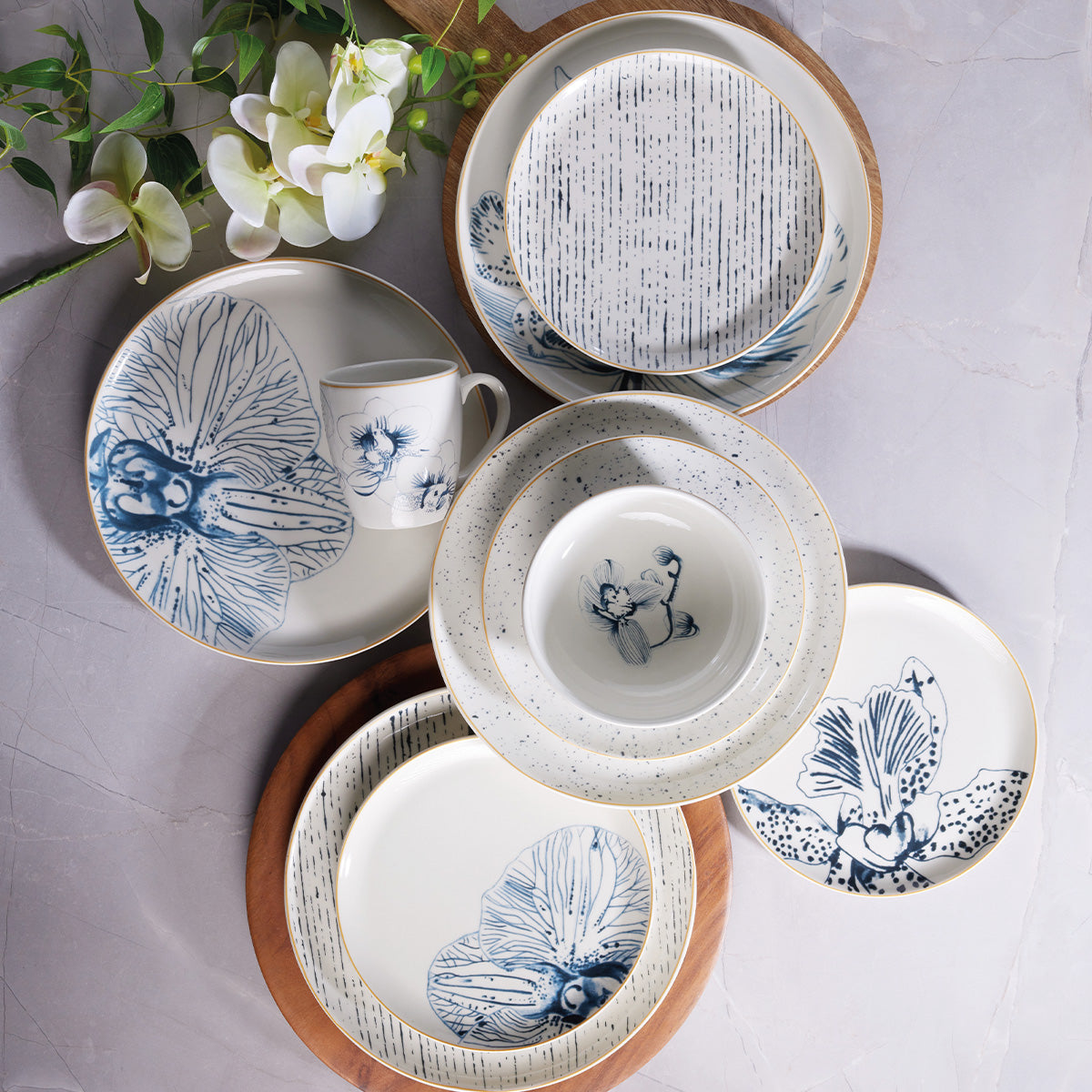 La sobriedad y la elegancia de las orquídeas de esta vajilla se combinan con patrones limpios y brillos de oro. Sus trazos irregulares pintados a mano y el diseño monocromático hacen de esta composición el complemento ideal para tu hogar.