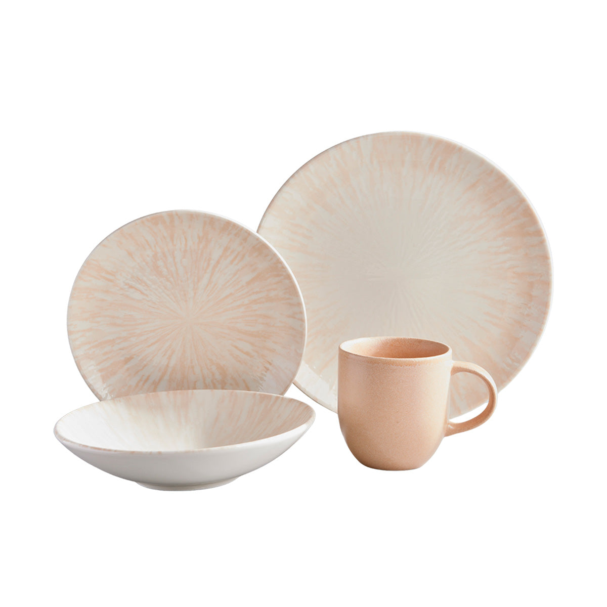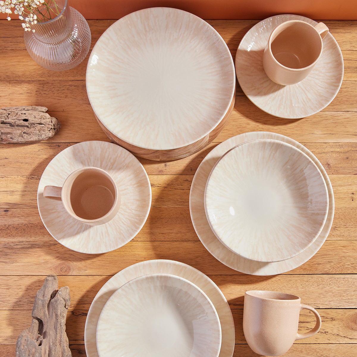 Inspirada en la calidez del sol y la serenidad de la arena, la Vajilla Nyssa combina texturas sutiles con un diseño armonioso que evoca la tranquilidad de la costa. Cada pieza ha sido concebida como un reflejo de la naturaleza en su estado más sereno, creando una atmósfera acogedora y elegante en la mesa.